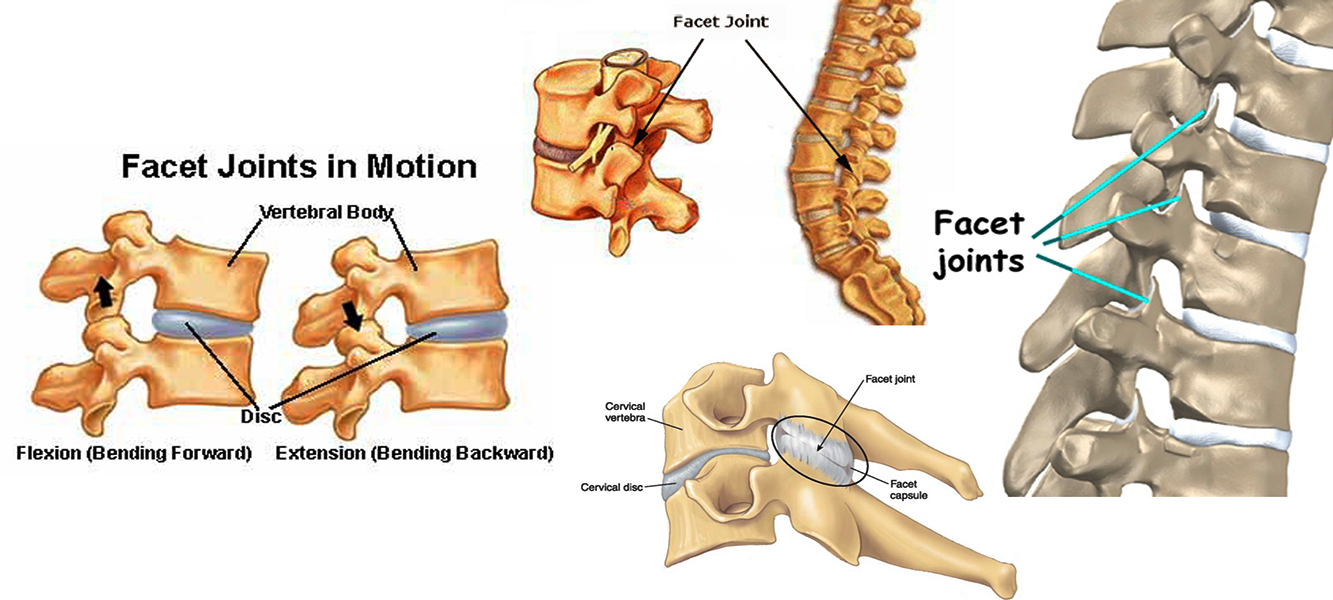 In the back of the spine hinge-like structures called facet joints are located. These joints link the vertebrae together along with the discs in front allowing for complex spinal motion. These joints may be injured by lifting or straining, severe twisting or hyperextension. Rest, ice and a few Aspirin will often help the pain. Facet injections with a small amount of anesthetic and cortisone are sometimes performed in resistant cases